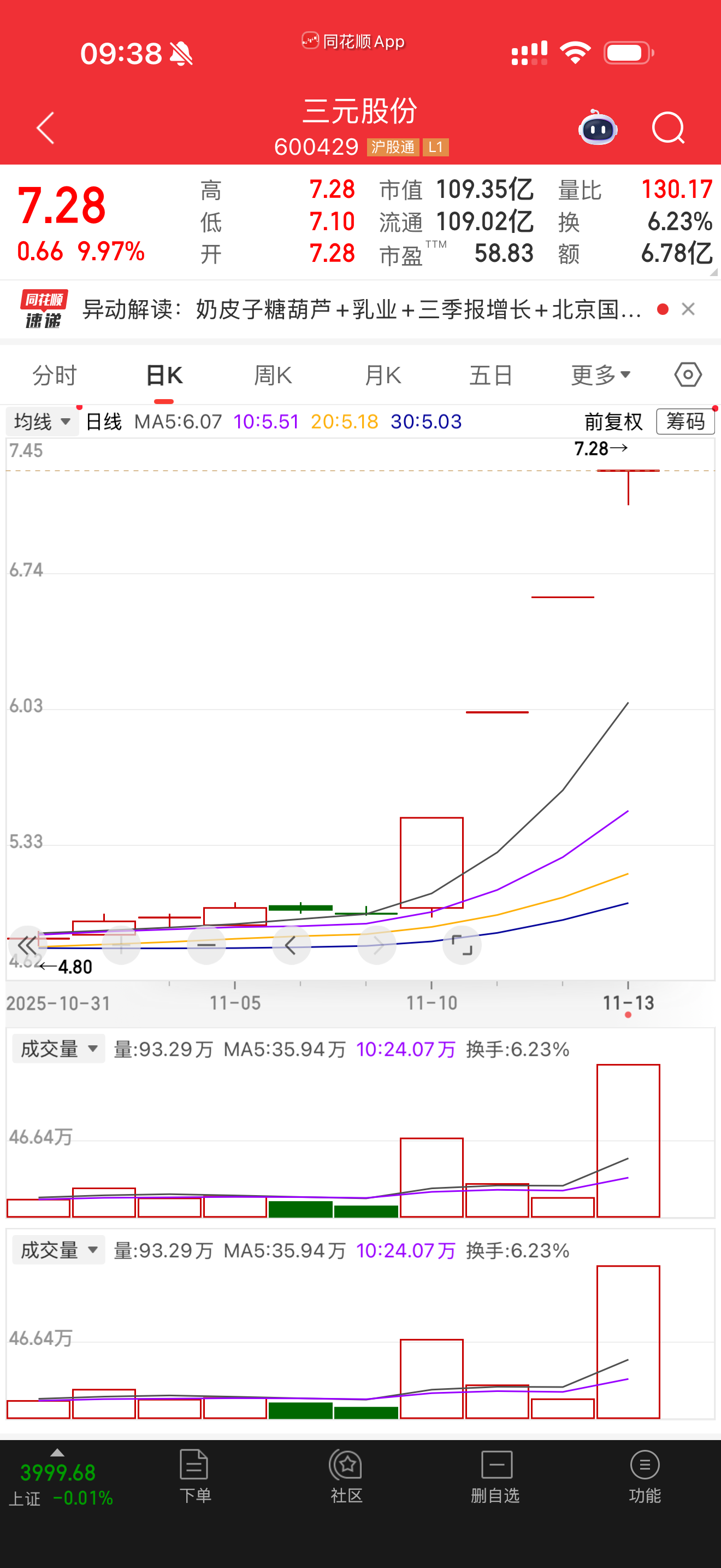 11月13日開盤,三元股份(600429)股價再次漲停,股價走出“4連板”。在9時37分,其漲停被短暫打開,隨即快速封住漲停。