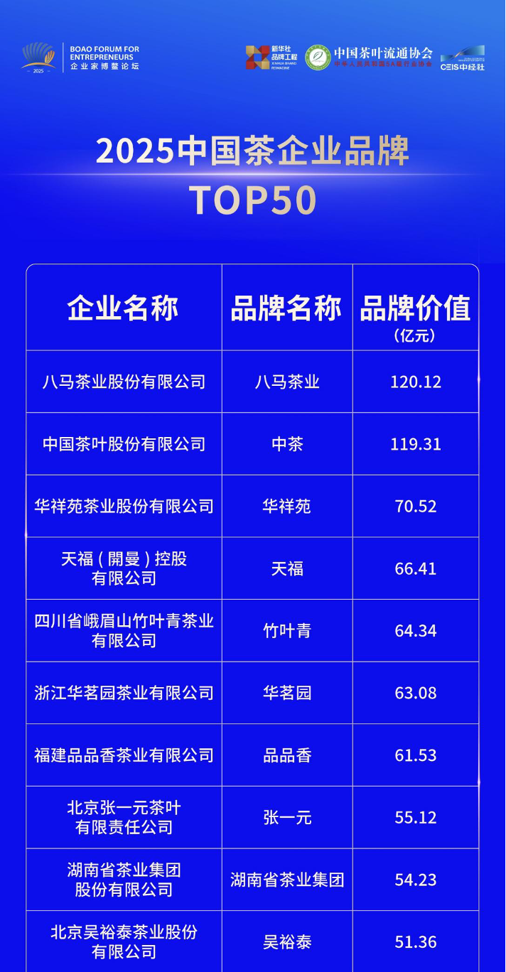 在隨后舉辦的中國(guó)茶品牌建設(shè)論壇上,八馬茶業(yè)榮膺由中國(guó)茶葉流通協(xié)會(huì)、新華社中國(guó)經(jīng)濟(jì)信息社共同評(píng)選的“2025中國(guó)茶企業(yè)品牌調(diào)查結(jié)果TOP50”第一名,同時(shí)斬獲“2025外國(guó)人喜愛(ài)的中國(guó)茶品牌”獎(jiǎng)項(xiàng)。
