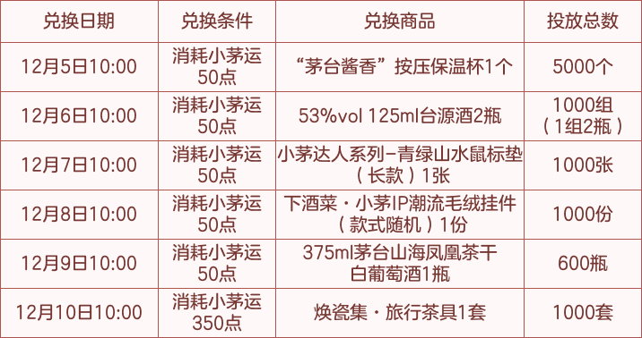 12月5日-12月10日每日10:00,“小茅權(quán)益屋”可兌換商品“上新”啦!親們可消耗小茅運(yùn)兌換權(quán)益商品,連續(xù)6天,天天有“新禮”,先到先得,兌完即止。