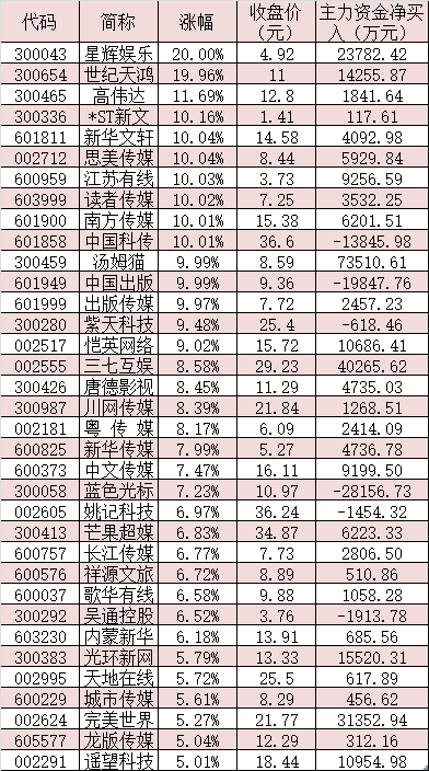 受此影響,4月24日,文化傳媒板塊表現(xiàn)強勢,其整體漲2.11%,跑贏上證指數(shù)(跌0.78%)。其中,星輝娛樂、世紀(jì)天鴻20CM漲停,思美傳媒、新華文軒、江蘇有線、讀者傳媒、中國科傳、南方傳媒、中國出版、出版?zhèn)髅降?只個股也實現(xiàn)漲停,高偉達、*ST新文、湯姆貓、紫天科技、愷英網(wǎng)絡(luò)等個股漲幅也均超9%。