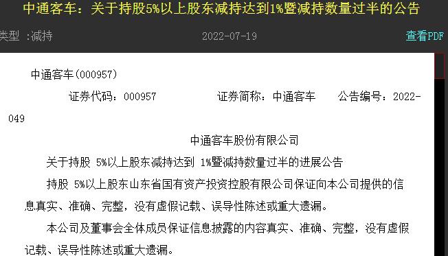 與此同時,今日,中通客車發(fā)布了關(guān)于持股5%以上股東減持達到1%暨減持數(shù)量過半的公告。