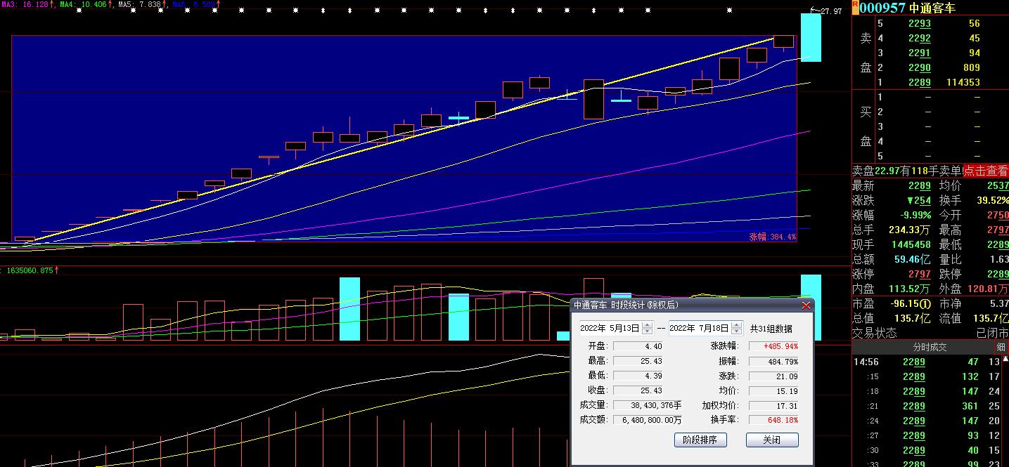可以看到,自5月13日起,中通客車連續(xù)收獲漲停,截至7月18日,31個交易累計漲幅達485.94%。
