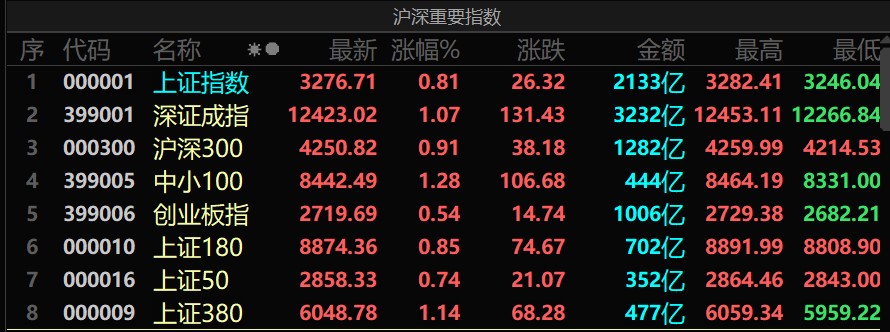 周二(7月26日),A股三大指數(shù)震蕩走強(qiáng),集體上漲。截至上午收盤,上證指數(shù)漲0.81%,深證成指漲1.07%,創(chuàng)業(yè)板指漲0.54%;滬深兩市合計(jì)成交額5365億元,總體來看,兩市個(gè)股漲多跌少。