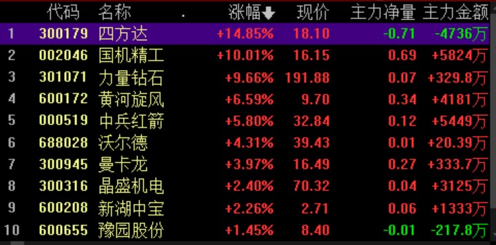 具體來看,同花順數(shù)據(jù)顯示,7月26日上午,培育鉆石板塊領(lǐng)漲,整體漲5.61%,板塊內(nèi)個(gè)股全部實(shí)現(xiàn)上漲,其中,國(guó)機(jī)精工強(qiáng)勢(shì)漲停,四方達(dá)漲超14%。