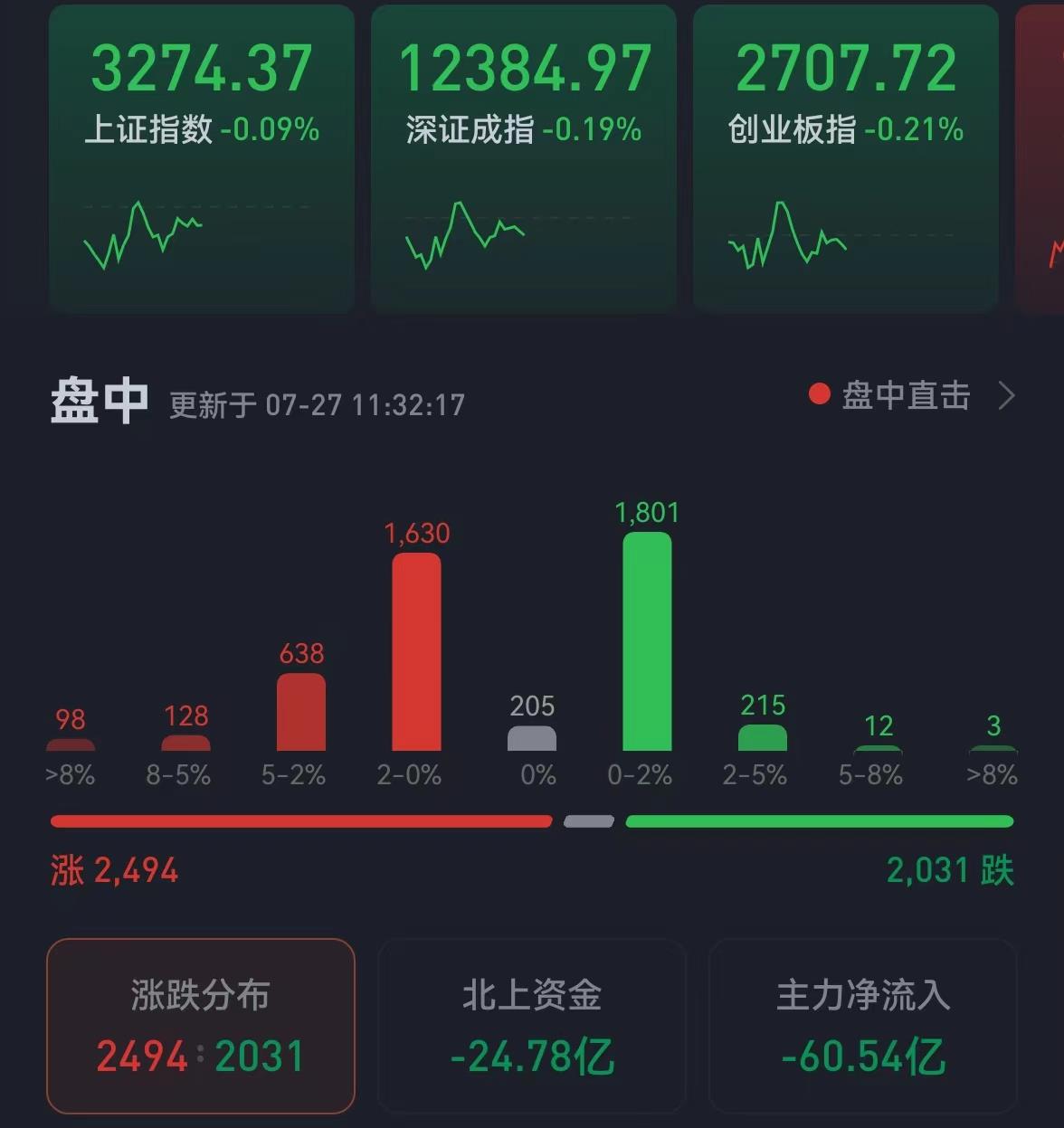 周三(7月27日),三大股指震蕩回落,小幅微跌。截至上午收盤,上證指數(shù)跌幅達(dá)0.09%,報3274.37點;深證成指和創(chuàng)業(yè)板指跌幅分別為0.19%和0.21%;滬深兩市合計成交額5274.5億元??傮w來看,兩市個股漲多跌少。