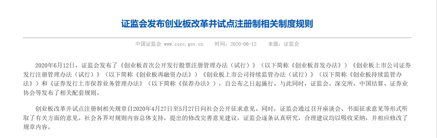 6月12日,證監(jiān)會發(fā)布創(chuàng)業(yè)板改革并試點注冊制相關(guān)制度規(guī)則。