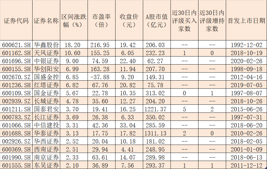個股方面,華鑫股份、天風證券、中銀證券、華創(chuàng)陽安、國盛金控、紅塔證券、國金證券等7只個股月內(nèi)累計漲幅逾5%。
