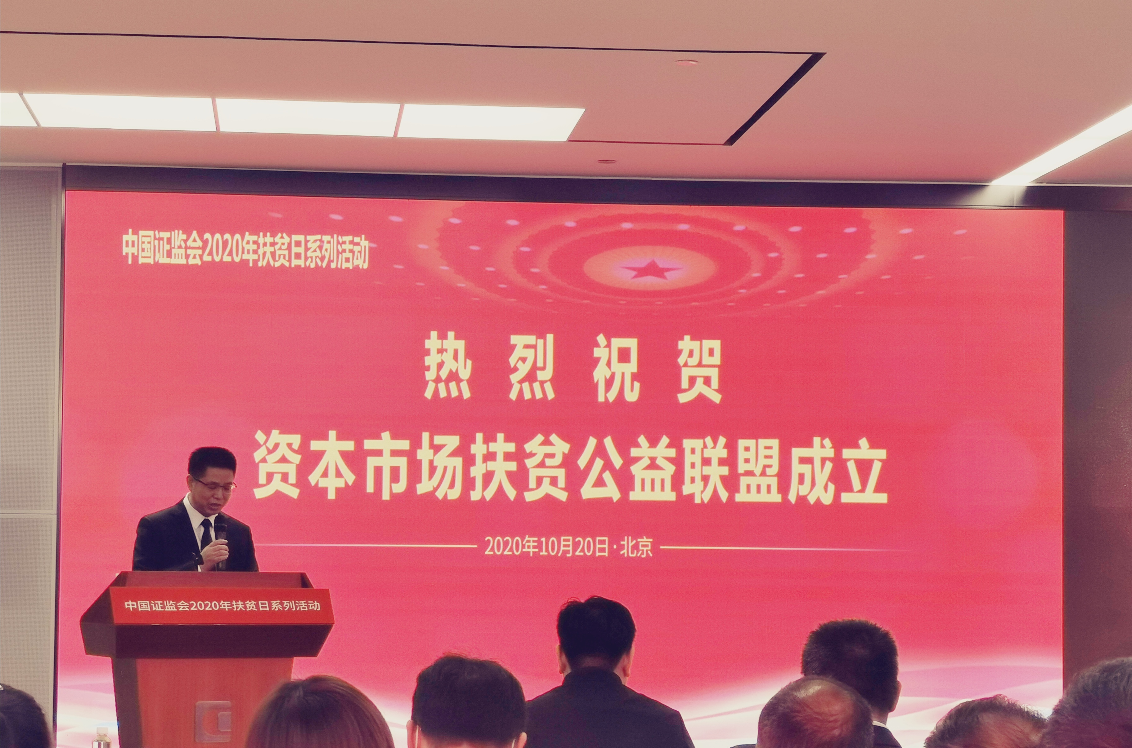10月20日,中國證監(jiān)會在北京順利舉辦資本市場“一縣(司)一品”線上展銷活動暨“資本市場扶貧公益聯(lián)盟”成立大會。大會在新保利大廈舉行,采取“現(xiàn)場活動+云直播”的形式。中國人民銀行、銀保監(jiān)會、證監(jiān)會、中投公司、建設(shè)銀行、農(nóng)業(yè)銀行、工商銀行、中國銀行、交通銀行、中國證券業(yè)協(xié)會、中國期貨業(yè)協(xié)會、中國上市公司協(xié)會、中國證券投資基金業(yè)協(xié)會、證券公司代表、期貨公司代表等近100家單位參會。