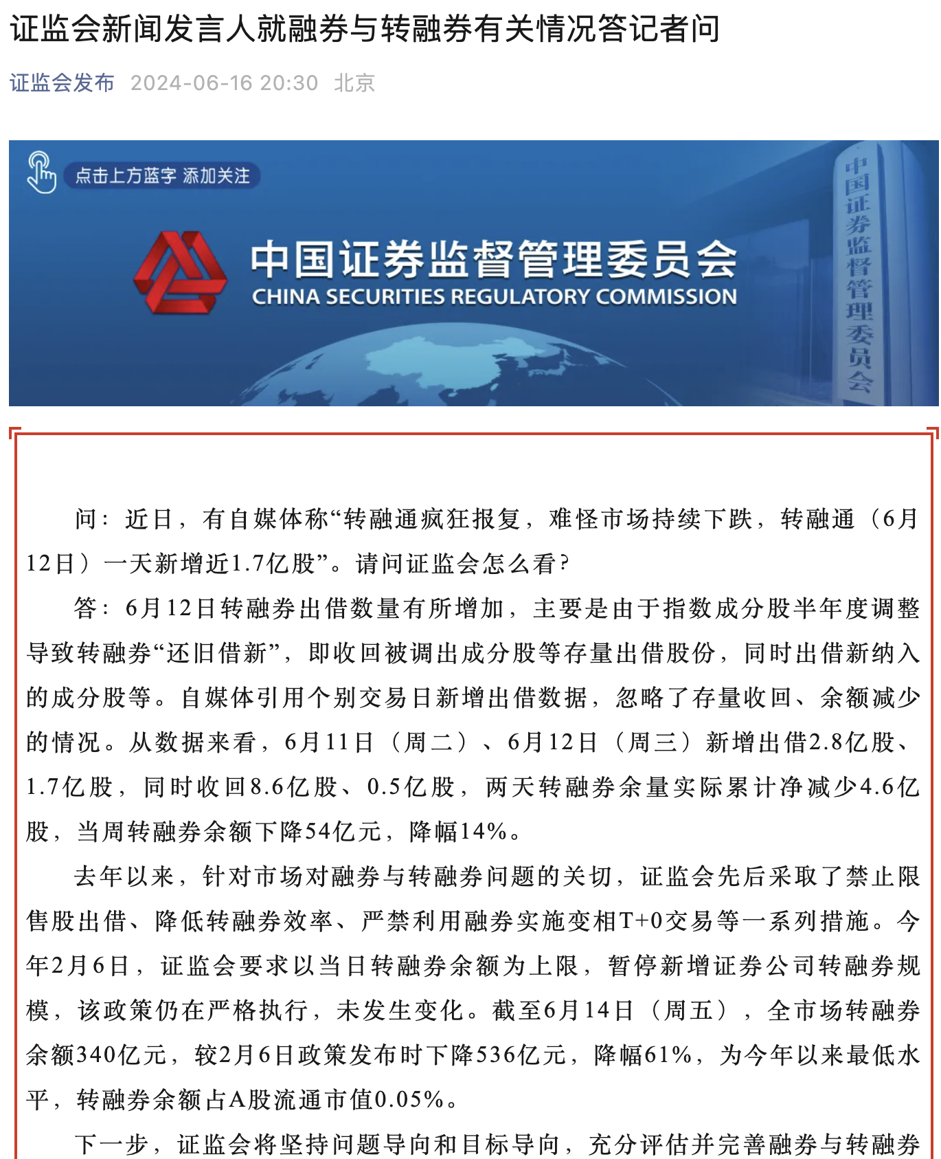 對此,6月16日,證監(jiān)會新聞發(fā)言人答記者問時(shí)表示,6月12日轉(zhuǎn)融券出借數(shù)量有所增加,主要是由于指數(shù)成分股半年度調(diào)整導(dǎo)致轉(zhuǎn)融券“還舊借新”,即收回被調(diào)出成分股等存量出借股份,同時(shí)出借新納入的成分股等。