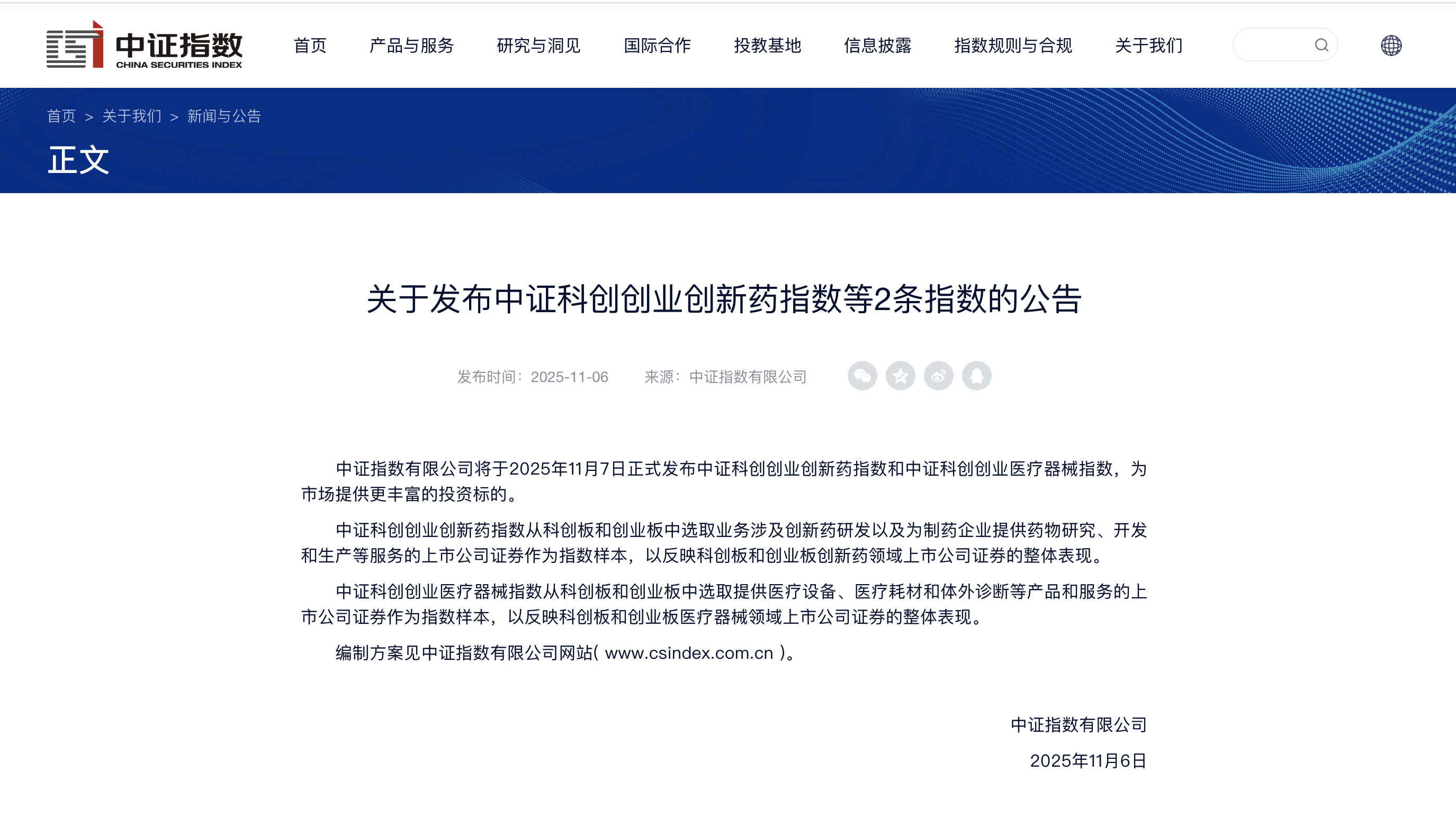 本報訊 (記者毛藝融)11月6日,中證指數(shù)有限公司公告稱,將于2025年11月7日正式發(fā)布中證科創(chuàng)創(chuàng)業(yè)創(chuàng)新藥指數(shù)和中證科創(chuàng)創(chuàng)業(yè)醫(yī)療器械指數(shù),為市場提供更豐富的投資標(biāo)的。