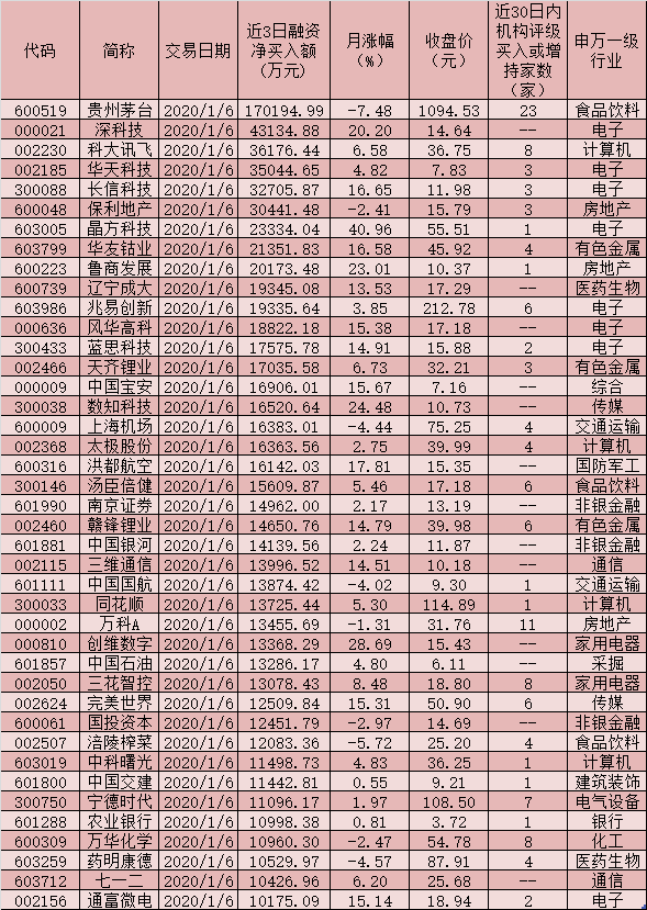 《證券日報》記者根據(jù)同花順數(shù)據(jù)統(tǒng)計發(fā)現(xiàn),1月2日至1月6日的3個交易日里,滬深兩市共有1077只兩融標的股實現(xiàn)融資凈買入,其中累計融資凈買入額超1億元的兩融標的股達到41只,貴州茅臺(17.02億元)、深科技(4.31億元)、科大訊飛(3.62億元)、華天科技(3.50億元)、長信科技(3.27億元)、保利地產(3.04億元)、晶方科技(2.33億元)、華友鈷業(yè)(2.14億元)和魯商發(fā)展(2.02億元)等9只個股期間累計融資凈買入額均達到2億元以上。另外,包括遼寧成大、兆易創(chuàng)新、風華高科、藍思科技、天齊鋰業(yè)、中國寶安等在內的32只個股期間累計融資凈買入額均達到或超過1億元,上述41只個股合計融資凈買入額達到86.53億元。