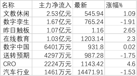 從大單資金流向來看,僅文教休閑(2.53億元)、數(shù)字孿生(1.67億元)、昨日觸板(1.07億元)、在線教育(1.03億元)、數(shù)字中國(6401萬元)、送轉(zhuǎn)預(yù)期(4297萬元)、CRO(2224萬元)、汽車行業(yè)(1461萬元)等8類板塊呈資金凈流入狀態(tài);大單資金流出的板塊則集中在融資融券(-210億元)、富時概念(-174億元)、標普概念(-158億元)、證金持股(-134億元)、深股通(-109億元)等,資金流出金額均在100億元之上。