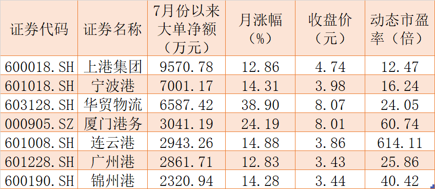 資金流向上,7月份以來,板塊內(nèi)共有13只概念股呈現(xiàn)大單資金凈流入態(tài)勢,上港集團(tuán)期間累計大單資金凈流入居首,達(dá)到9570.78萬元,寧波港(7001.17萬元)、華貿(mào)物流(6587.42萬元)、廈門港務(wù)(3041.19萬元)、連云港(2943.26萬元)、廣州港(2861.71萬元)和錦州港(2320.94萬元)等6只概念股當(dāng)日均受到2000萬元以上大單資金追捧,這7只概念股合計吸金3.43億元。