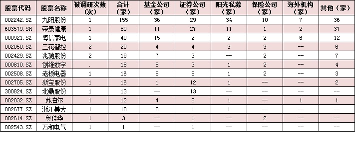 從參與調(diào)研的機(jī)構(gòu)家數(shù)來(lái)看,上述13家上市家用電器公司中,九陽(yáng)股份、榮泰健康、海信家電、三花智控等4家接待調(diào)研機(jī)構(gòu)家數(shù)均在20家及以上,分別為:155家、89家、40家和20家。值得注意的是,在13家獲機(jī)構(gòu)調(diào)研的家用電器公司中,10家為中小創(chuàng)公司,占機(jī)構(gòu)調(diào)研公司比例的77%。