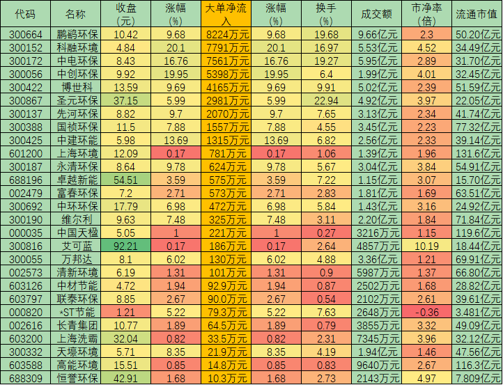 表:周一環(huán)保工程板塊大單凈流入股一覽