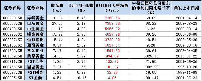 表:12只黃金股按9月15日大單資金凈流入情況排序