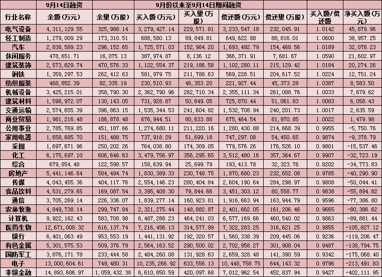 表:9月份以來截至9月14日28個(gè)申萬一級(jí)行業(yè)融資情況