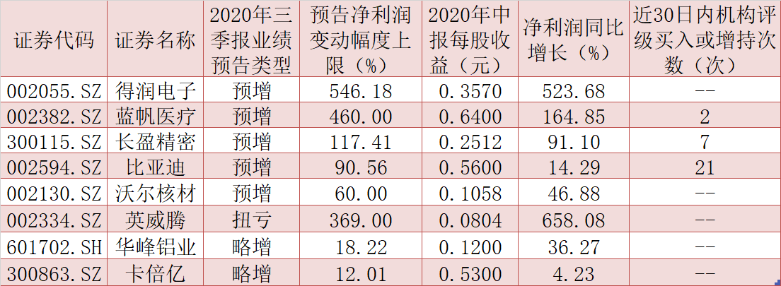 今年三季報業(yè)績預告方面,截至目前,有21家相關(guān)上市公司率先披露了2020年三季報業(yè)績預告,得潤電子、藍帆醫(yī)療、長盈精密、比亞迪、沃爾核材、英威騰、華峰鋁業(yè)、卡倍億等8家公司2020年前三季度凈利潤均有望同比增長。