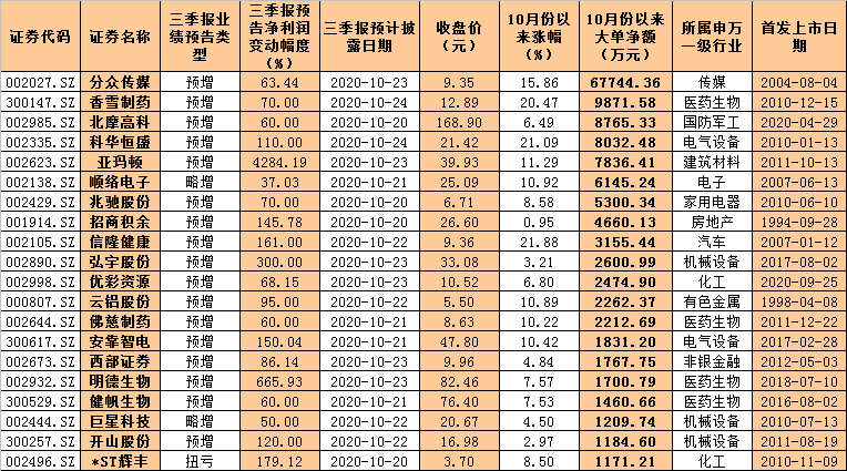 表:月內(nèi)大單資金凈流入居前的三季報預(yù)喜股一覽