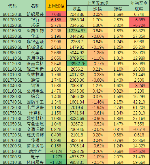 本周,滬深兩市在周一長陽沖高后即進入震蕩整理,滬指收報3336.36點,周漲幅1.96%,深指收報13532.73點,周漲幅1.83%,周成交額41053.06億元,北上與兩融資金均呈現(xiàn)流入態(tài)勢。行業(yè)指數(shù)方面,上周有25類申萬一級行業(yè)上漲,占比89.29%,紡織服裝以7.68%居首,另有包括銀行、采掘和醫(yī)藥生物在內(nèi)的10類行業(yè)漲幅超2%,下跌行業(yè)僅休閑服務(wù)、電子和房地產(chǎn)3類。