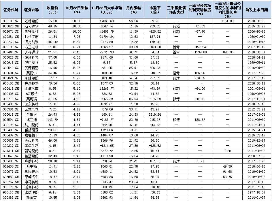 而僅從10月22日來看,逾四成新能源車概念股逆市上漲,其中,雙林股份、石大勝華、國軒高科等3只個股強勢漲停,包括杉杉股份、德方納米、方正電機、天齊鋰業(yè)、銳新科技等在內(nèi)的12只個股漲幅也均在5%以上。此外,宇通客車、杭叉集團、朗博科技等12只個股股價均在盤中創(chuàng)出年內(nèi)新高。