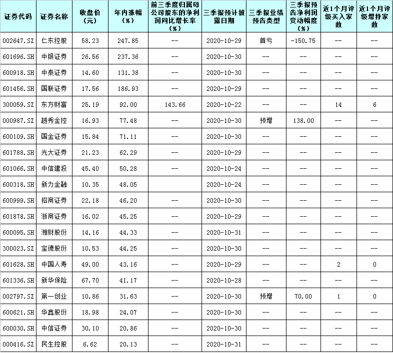 表:年內(nèi)漲幅在20%以上的非銀金融股一覽