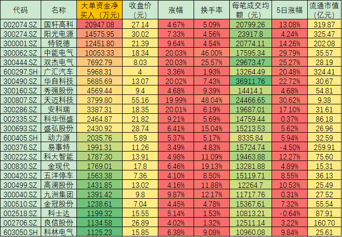行業(yè)景氣度和政策的利好疊加,令充電樁板塊在弱市震蕩中得到了場(chǎng)內(nèi)資金的青睞。周一,充電樁板塊整體大單資金凈流入合計(jì)5.11億元,其中,國(guó)軒高科(20947.08萬(wàn)元)、陽(yáng)光電源(14575.95萬(wàn)元)、特銳德(12451.80萬(wàn)元)、中能電氣(10053.33萬(wàn)元)等4只個(gè)股大單凈流入超1億元,此外,另有包括雙杰電氣、廣匯汽車、華自科技等在內(nèi)的19只個(gè)股大單凈流入額均超1000萬(wàn)元,以上23只個(gè)股合計(jì)大單凈流入11.07億元。
