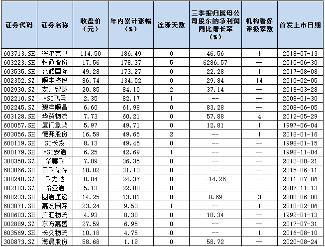 表:年內(nèi)實(shí)現(xiàn)上漲的物流股一覽