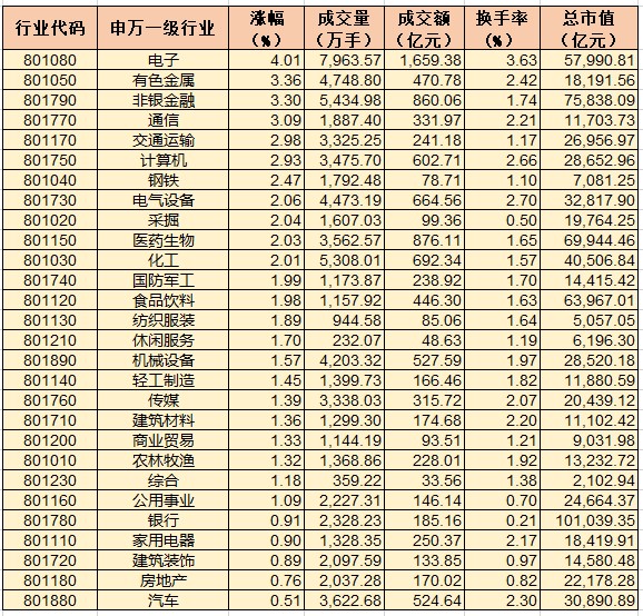 表:2020年11月9日申萬一級行業(yè)市場表現(xiàn)一覽
