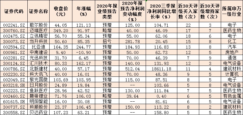 表:近30日內(nèi)機構(gòu)看好評級超10次以上的雙增長股情況
