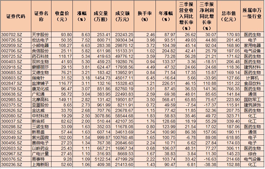 表:12月1日漲幅超1%調(diào)入股市場表現(xiàn)一覽