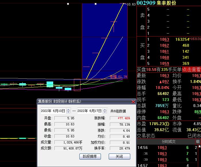 6月17日,集泰股份再度漲停,截至收盤,報10.63元,總市值達39.62億元,連續(xù)6個交易日漲停,期間累計漲幅達77.46%。