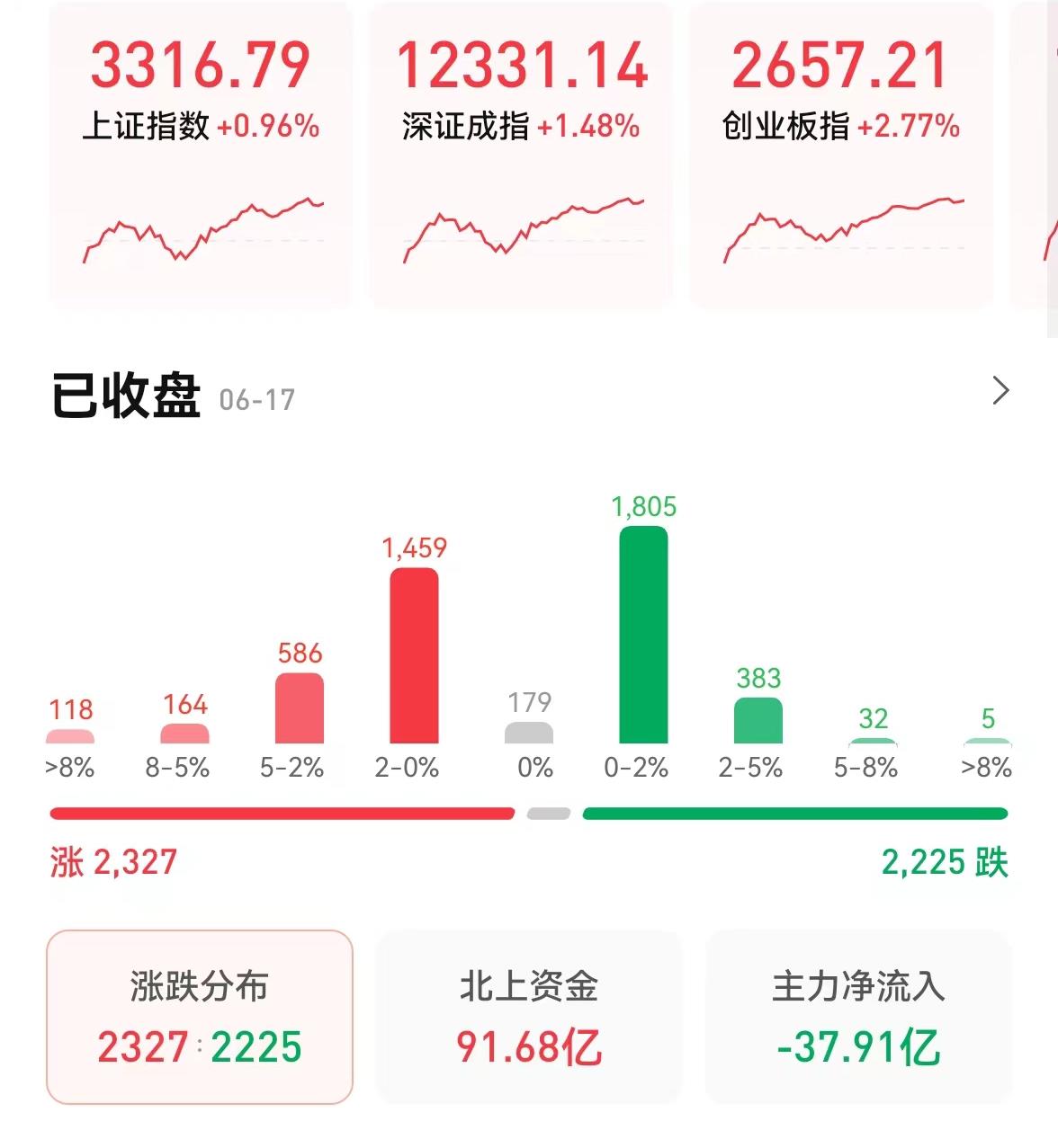 6月17日,三大股指低開高走,集體收漲,截至收盤,上證指數(shù)漲0.96%報3316.79點,深證成指漲1.48%報12331.14點,創(chuàng)業(yè)板指漲2.77%報2657.21點;兩市合計成交10934億元,連續(xù)第6個交易日突破萬億元;北向資金凈買入91.68億元??傮w來看,A股個股漲多跌少。其中,有76只個股漲停。