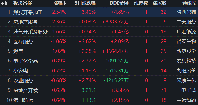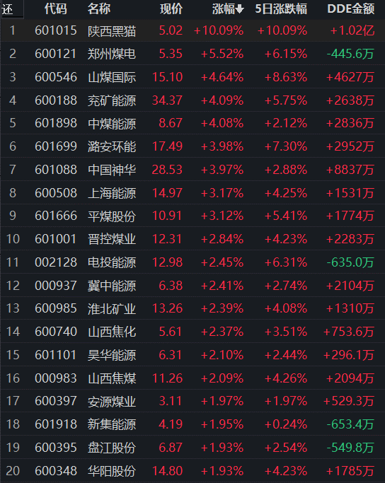 從早盤表現強勢的煤炭開采加工行業(yè)看,交易中的34只成份股有32只上漲,其中2只漲幅超5%。從資金流向看,煤炭開采加工行業(yè)大單資金凈流入額為4.89億元,居行業(yè)第一位。