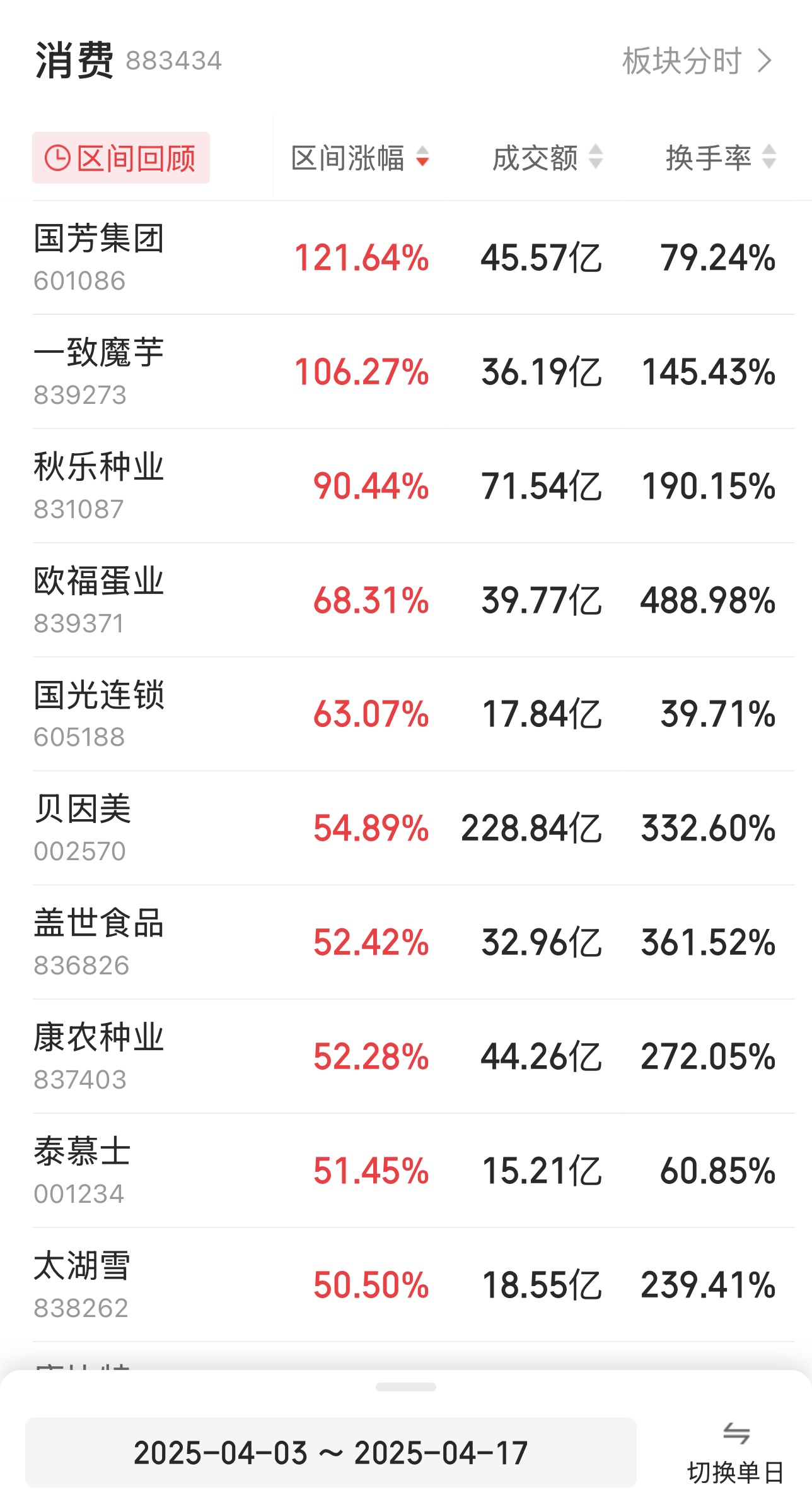 4月17日,A股主打“吃喝玩樂穿”,大消費(fèi)股盤中再度走強(qiáng)。截至收盤,安記食品股份有限公司(簡(jiǎn)稱“安記食品”,603696.SH)、天津桂發(fā)祥十八街麻花食品股份有限公司(簡(jiǎn)稱“桂發(fā)祥”,002820.SZ)、甘肅國芳工貿(mào)(集團(tuán))股份有限公司(簡(jiǎn)稱“國芳集團(tuán)”,601086.SH)、江西國光商業(yè)連鎖股份有限公司(簡(jiǎn)稱“國光連鎖”,605188.SH)等多只股票漲停。據(jù)同花順數(shù)據(jù),今日消費(fèi)板塊超20只個(gè)股漲停。
