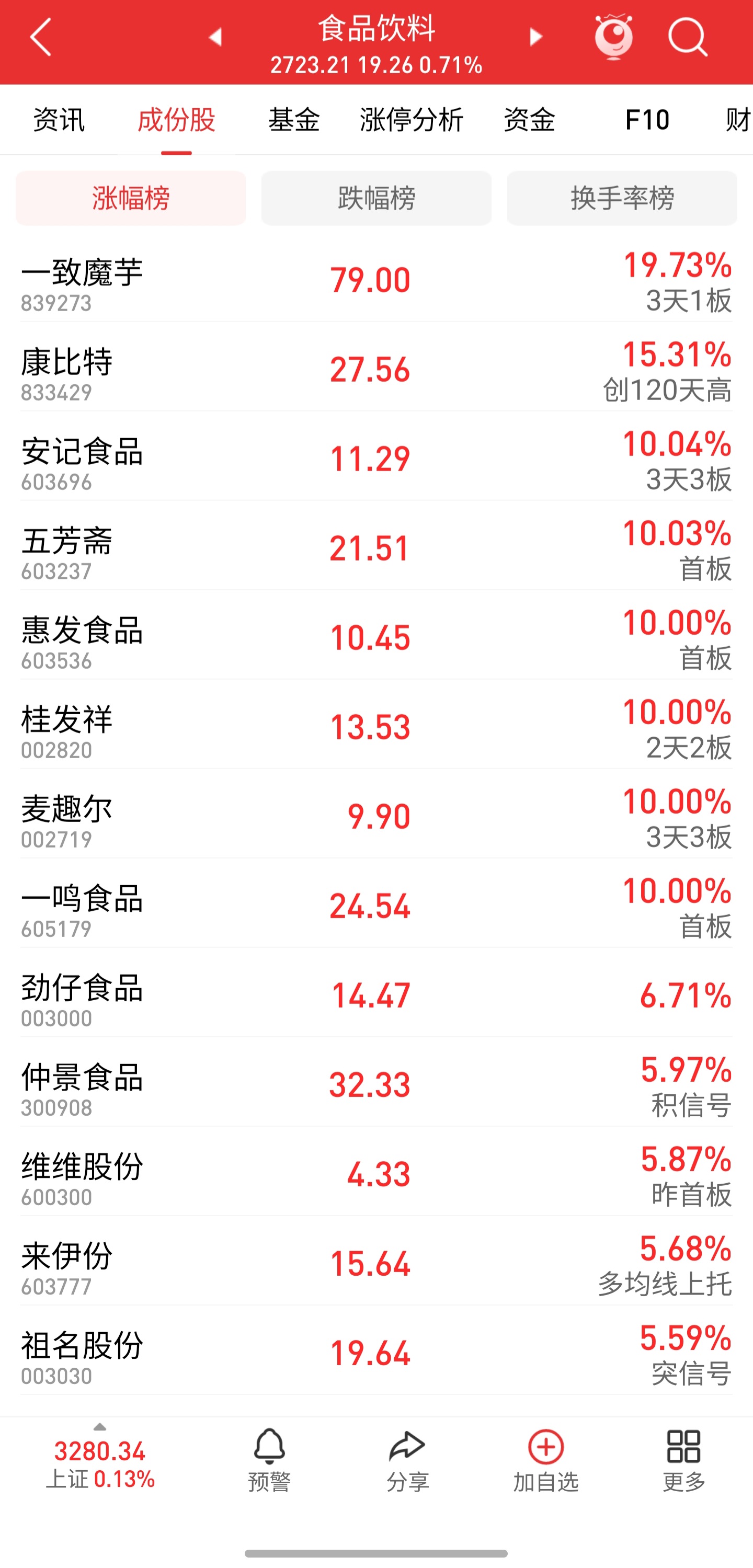 據(jù)通達(dá)信數(shù)據(jù),截至4月17日收盤(pán),食品飲料板塊整體飄紅,安記食品(股票代碼:603696)、五芳齋(股票代碼:603237)、惠發(fā)食品(股票代碼:603536)等多只個(gè)股漲停,該板塊中,一致魔芋(股票代碼:839273)漲幅格外奪目,其股價(jià)收盤(pán)漲19.73%,報(bào)79元/股。