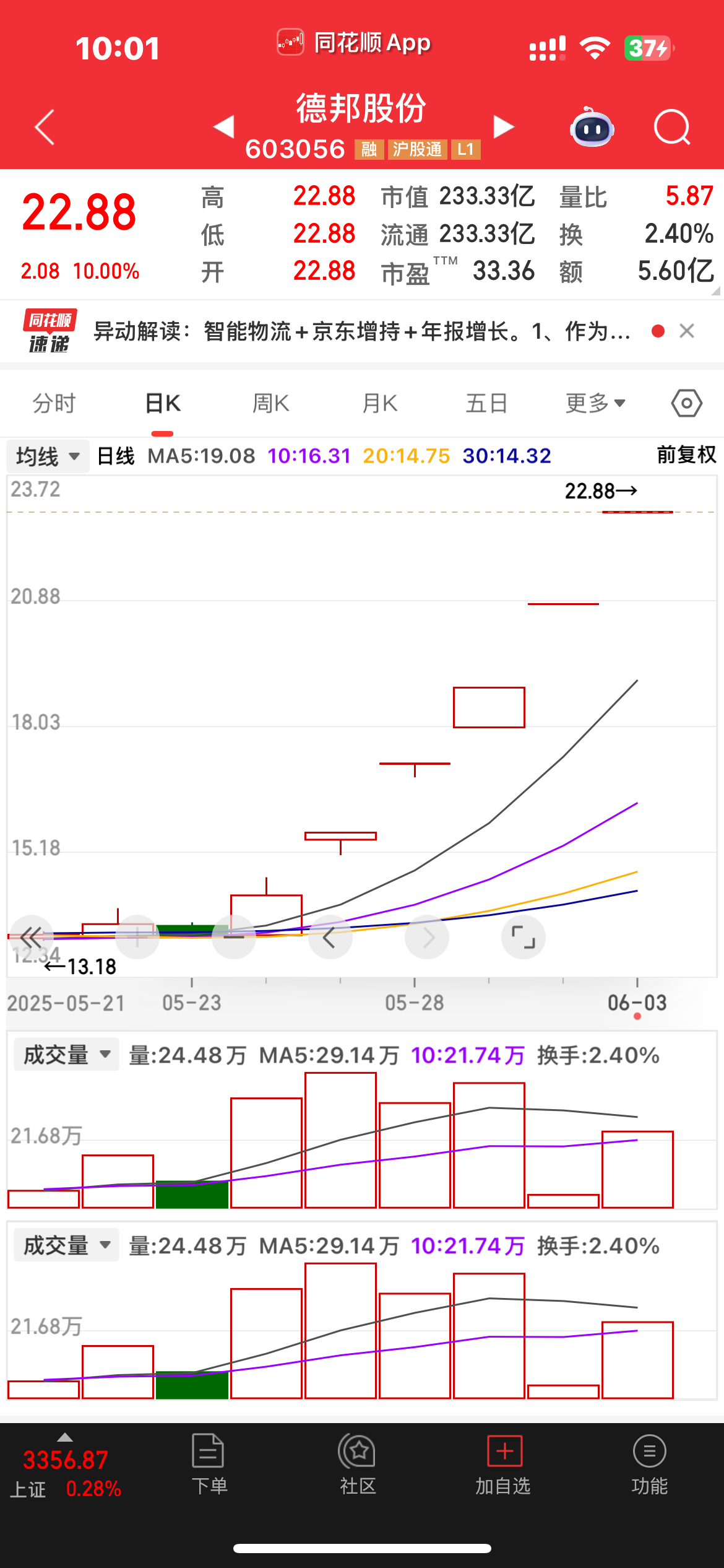 6月3日,德邦股份(股票代碼:603056)早盤漲停,實現(xiàn)五連板。截至記者發(fā)稿,公司股價封于22.88元/股,總市值達233.33億元。