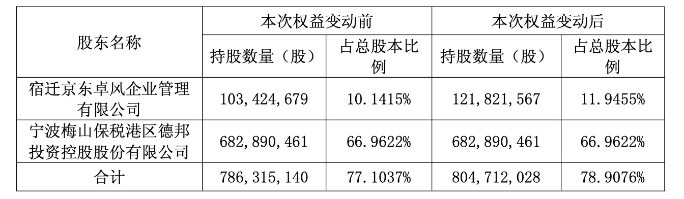德邦股份公告顯示,4月28日至5月7日期間,宿遷京東卓風企業(yè)管理有限公司(以下簡稱“京東卓風”)通過集中競價交易方式、大宗交易方式增持公司股份共18396888股,占公司目前總股本的比例為1.8039%。本次權益變動后,京東卓風直接持有公司股份121821567股,約占公司總股本的11.9455%,德邦控股及京東卓風合計持有公司股份804712028股,約占公司總股本的78.9076%。
