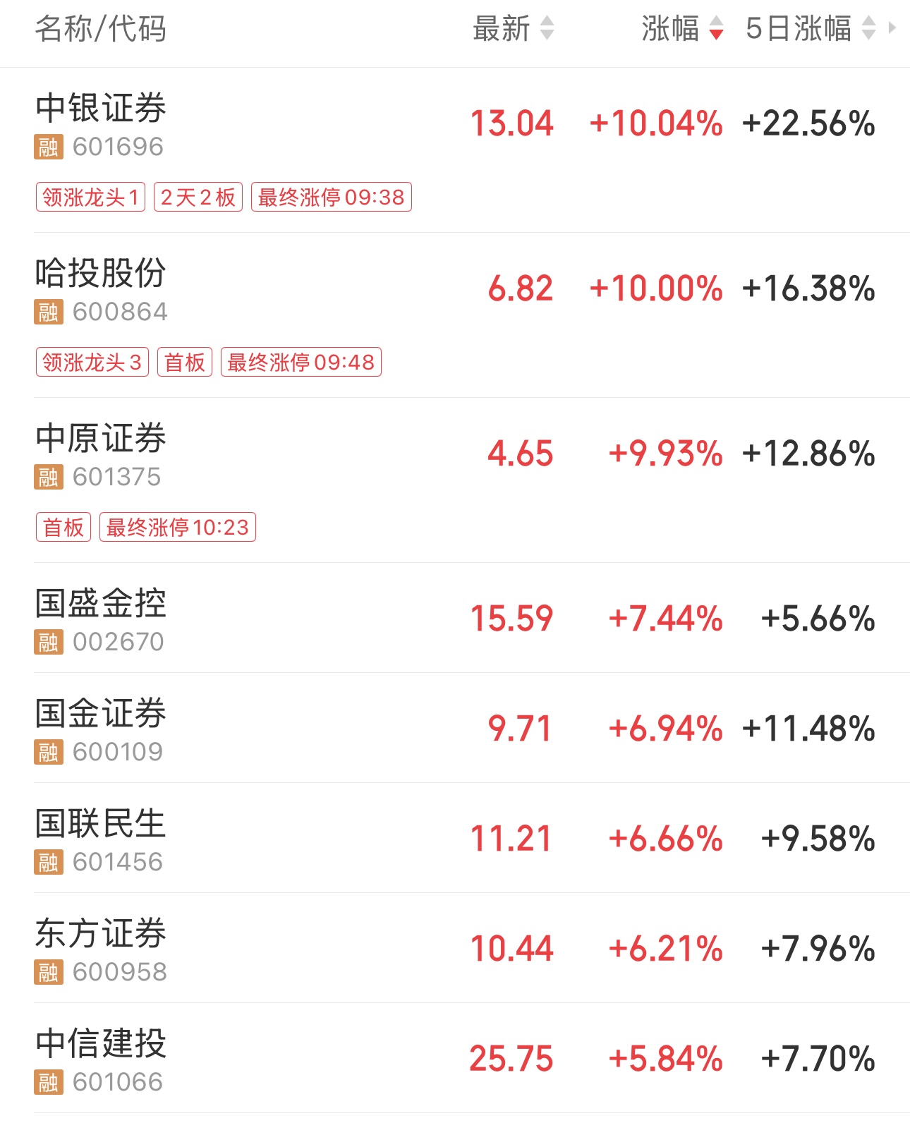 同花順數(shù)據(jù)顯示,截至午間收盤,證券板塊整體漲幅達(dá)4.13%,板塊成交額達(dá)657.8億元,板塊內(nèi)49只個股全線上漲。其中,中銀證券、哈投股份、中原證券3只個股漲停,國盛金控漲超7%,國金證券、國聯(lián)民生、東方證券漲幅均超6%。
