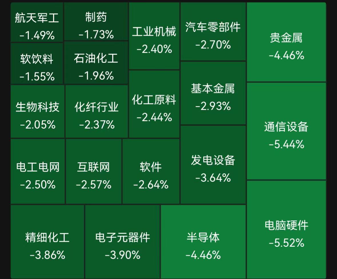 A股市場上,午后貴金屬、有色金屬個股應(yīng)聲下跌;截至當(dāng)日收盤,wind貴金屬行業(yè)板塊下跌4.46%,基本金屬板塊收跌2.93%,其中盛達(dá)資源下跌8.39%、洛陽鉬業(yè)、興業(yè)銀錫跌超7%、江西銅業(yè)下跌6.81%、紫金礦業(yè)下跌5.75%、四川黃金、赤峰黃金等多只個股跌超4%。