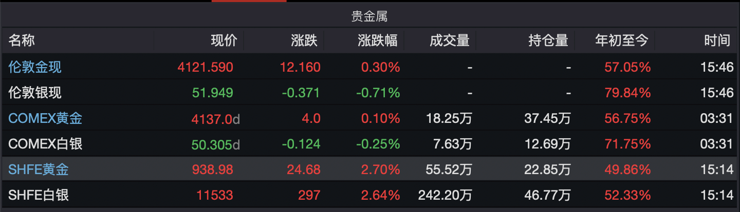 10月14日早盤,黃金白銀繼續(xù)大漲!現(xiàn)貨黃金(倫敦金現(xiàn))盤中最高觸及4179.748美元/盎司高點,COMEX黃金最高觸及4190.9美元/盎司,滬金(SHFE黃金)最高觸及958.10元/克;現(xiàn)貨白銀(倫敦銀現(xiàn))最高觸及53.579美元/盎司;COMEX白銀最高觸及52.495美元/盎司,滬銀盤中最高觸及12096元/千克。
