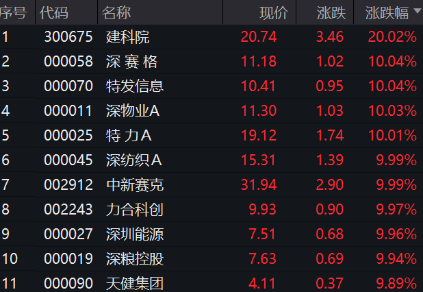 截至午間收盤,多只深圳本地股漲停,建科院以20.02%漲幅領(lǐng)漲,深賽格、特發(fā)信息、深物業(yè)A、特力A、深紡織A、中新賽克、力合科創(chuàng)、深圳能源、深糧控股、天健集團等股均“10cm”漲停。另外,麥捷科技、深圳燃氣等股均漲超4%。