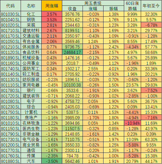 行業(yè)指數(shù)方面,本周有12類申萬一級行業(yè)上漲,占比42.86%,化工以3.57%的周漲幅居首,鋼鐵和采掘分別以3.53%和2.81%位居第二位和第三位;跌幅居前的3類行業(yè)分別是汽車(-3.50%)、傳媒(-2.35%)、通信(-1.67%)。