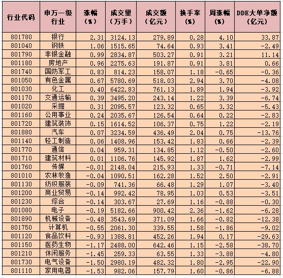 從資金流向來看,有2個行業(yè)板塊獲得大單資金凈流入,合計吸金45.01億元,其中,銀行板塊獲得大單資金凈流入33.87億元,非銀金融行業(yè)獲得11.14億元大單資金凈流入。