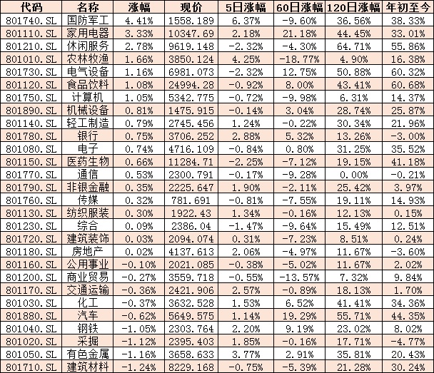 熱點(diǎn)方面,從申萬(wàn)一級(jí)28個(gè)行業(yè)來(lái)看,周四有19個(gè)行業(yè)指數(shù)實(shí)現(xiàn)上漲。其中,國(guó)防軍工行業(yè)指數(shù)午后爆發(fā),以4.41%的漲幅領(lǐng)漲,家用電器、休閑服務(wù)等兩行業(yè)指數(shù)漲幅均超2%;而此前表現(xiàn)活躍的建筑材料、有色金屬、采掘和鋼鐵等行業(yè)指數(shù),跌幅居前均超1%。