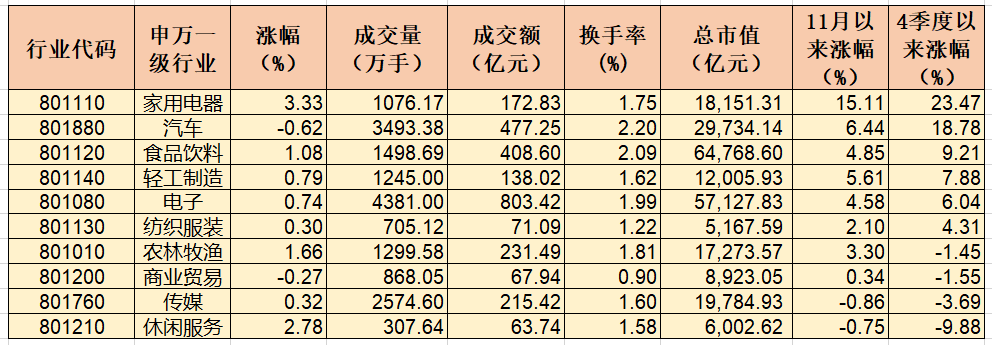 隨著經(jīng)濟(jì)的不斷復(fù)蘇,大消費概念股近期也迎來了上漲行情。四季度以來,截至11月19日收盤,上證指數(shù)累計上漲4.51%。從行業(yè)指數(shù)表現(xiàn)來看,大消費板塊相關(guān)的行業(yè)指數(shù)漲幅多數(shù)跑贏大盤,其中,家用電器行業(yè)領(lǐng)漲申萬一級行業(yè)指數(shù),指數(shù)累計漲23.47%,汽車行業(yè)指數(shù)漲18.78%,食品飲料行業(yè)指數(shù)漲9.21%,輕工制造行業(yè)指數(shù)漲7.88%,電子行業(yè)指數(shù)漲6.04%,紡織服裝行業(yè)指數(shù)漲4.31%。