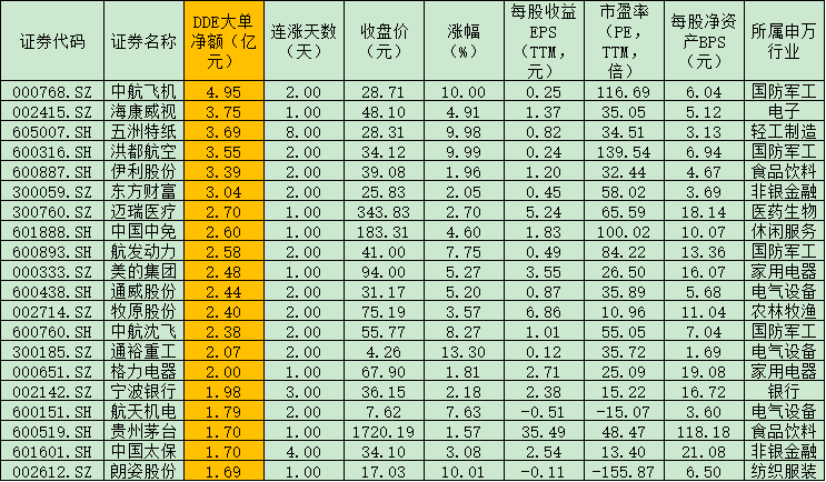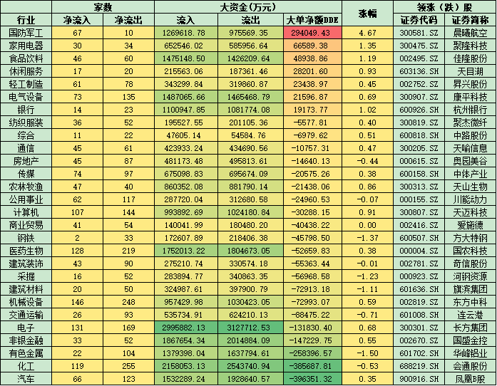 從資金層面看,今日A股大單資金整體凈流出143.75億元,占成交額1.86%,有1516只個股凈流入,2504只個股凈流出。有7類申萬一級行業(yè)呈現(xiàn)大單資金凈流入,國防軍工、家用電器、食品飲料等位居前三。