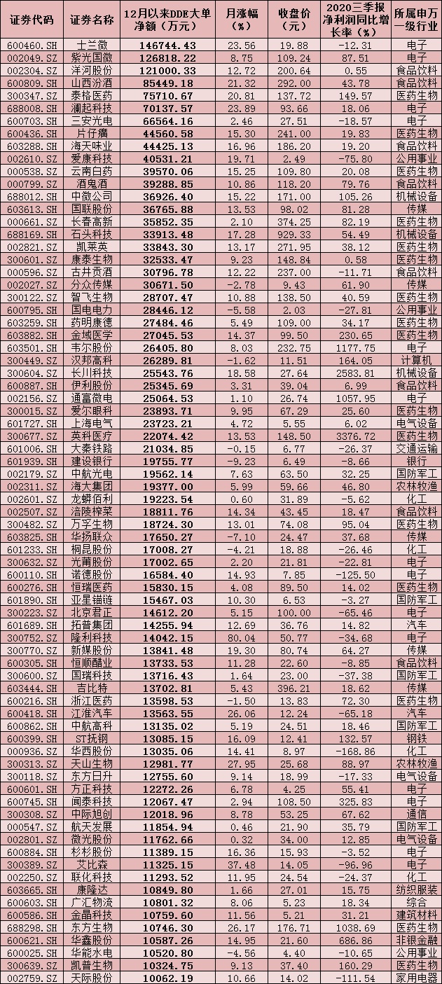 表:12月份以來大單資金凈流入超億元的個股情況:
