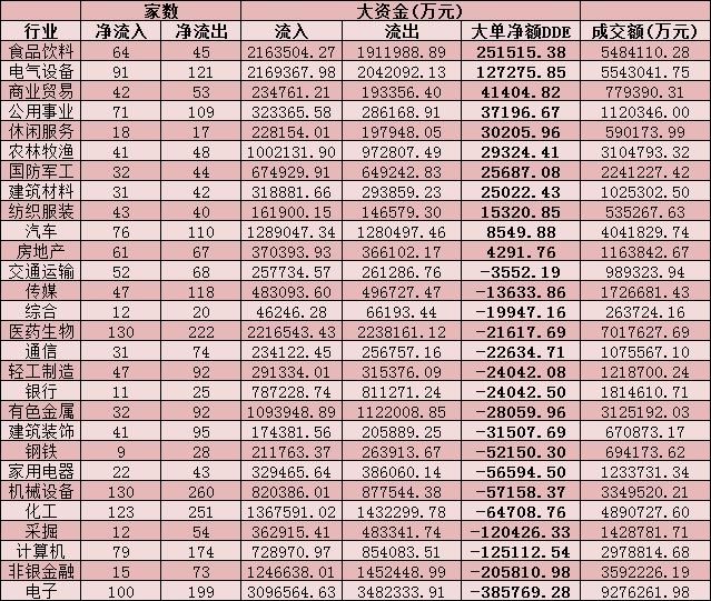 從資金層面看,今日A股大單資金整體凈流出66.07億元,其中,有1449只個(gè)股凈流入,2570只個(gè)股凈流出。從申萬(wàn)一級(jí)的28個(gè)行業(yè)來(lái)看,有11個(gè)行業(yè)呈現(xiàn)大單資金凈流入態(tài)勢(shì),其中,食品飲料、電氣設(shè)備等兩行業(yè),資金凈流入均超10億元,分別為25.15億元、12.72億元,合計(jì)資金凈流入達(dá)37.87億元。另外,電子、非銀金融、計(jì)算機(jī)、采掘等四行業(yè)資金凈流出居前,均超10億元。