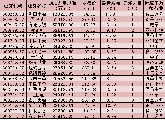 一、周一(12月14日)DDE大單資金凈買入TOP20